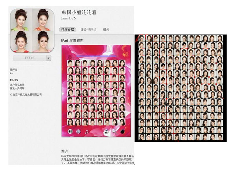 韩国小姐候选人的意外“撞脸”似乎成为了韩国整容技术的新代言。虽然组委会随后公布了佳丽们的素颜照以平息风波,并证明所谓的“撞脸”不过是韩国高超化妆术所发挥的作用罢啦,但仍然有人从中看到了很好的商机。“韩国小姐连连看”就是因此而开发出的小游戏。游戏发布之后,被众多网友称为“史上最难连连看、奇葩、太文艺了、神游戏……”。