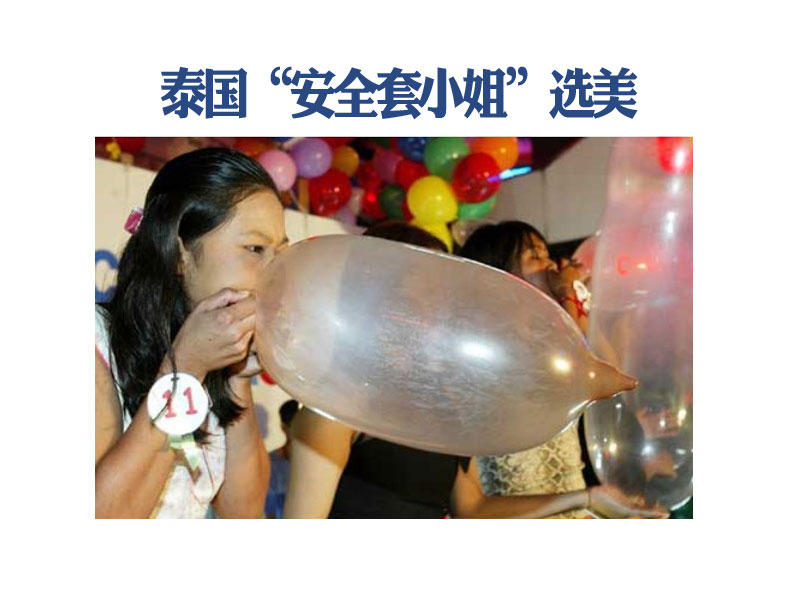 泰国选美活动千奇百怪,曼谷举行的“亚太安全套小姐”选美会上,参赛者正在比赛吹安全套。参赛者包括20名来自四个国家的女子,这次选美会用意是在泰国促进“安全性意识”,以防范艾滋病。