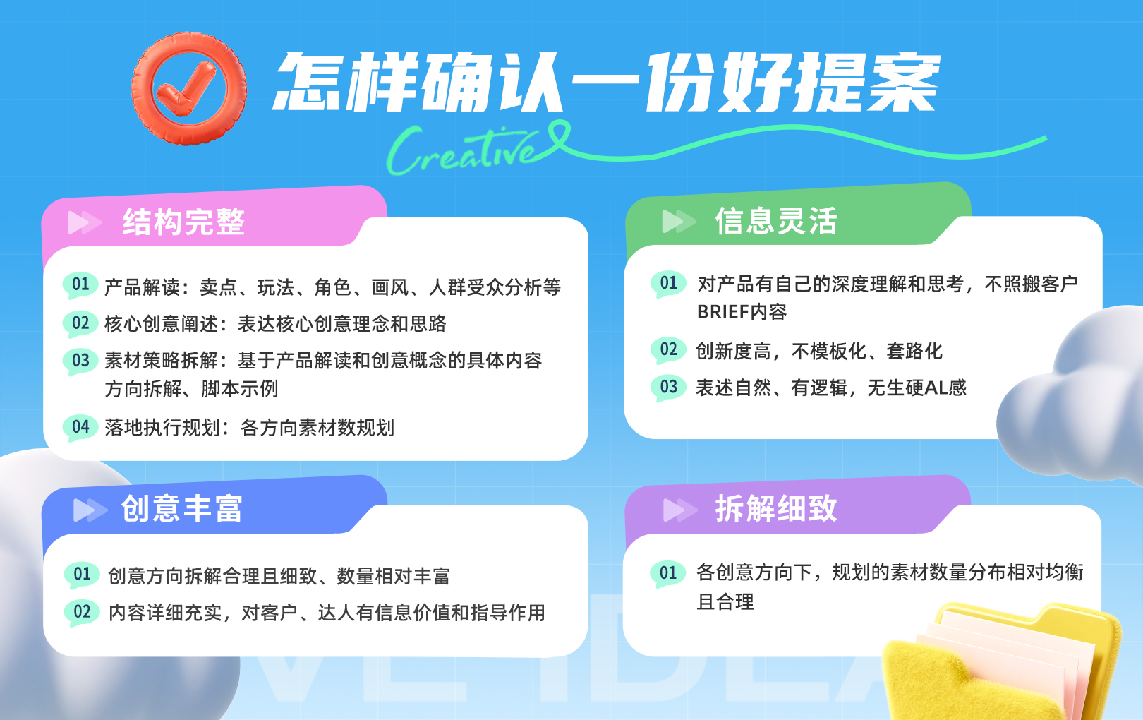 服务商提案的质量,是后续素材高质量交付的关键前置保障,其评估需聚焦“结构完整、信息灵活、创意丰富、拆解细致” 四大核心标准。