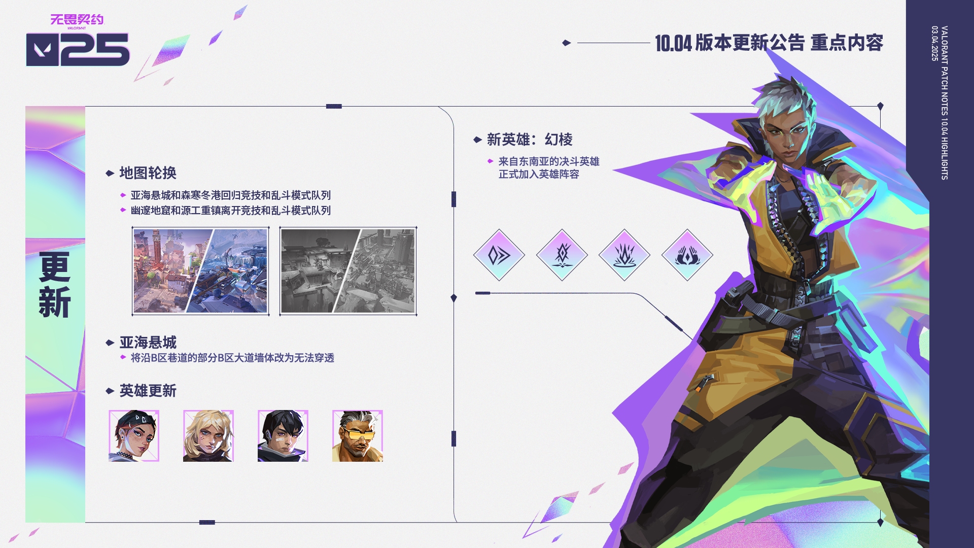 我们的英雄阵容再添一员!来自暹罗湾北岸的全新决斗者——幻棱正式登场!我们已经等不及想一睹各位的精彩操作了,到时记得把你们力克千钧、团灭对手的英姿上传出来给大家看看哦!此外,我们对暮蝶、钢锁、壹决和钛狐进行了重大调整,同时也为霓虹准备了一个小小的视效更新。另一方面,幽邃地窟和源工重镇将暂时离开地图池,接替它们上场的则是亚海悬城和森寒冬港。如果你喜欢在亚海悬城里玩奥丁,那你可能需要重新思考一下策略,想想该如何守住B区大道了。