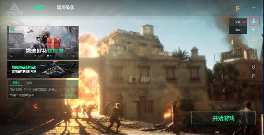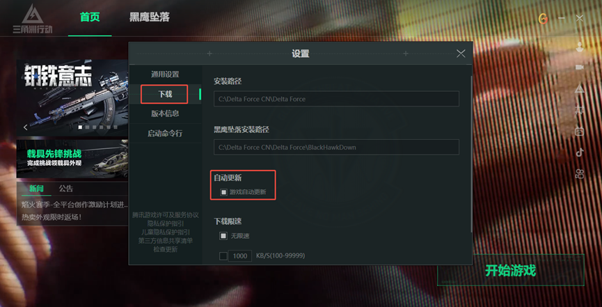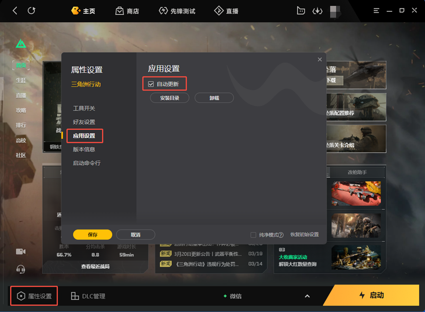 进入《三角洲行动》主页,点击左下角属性设置-应用设置,勾选自动更新