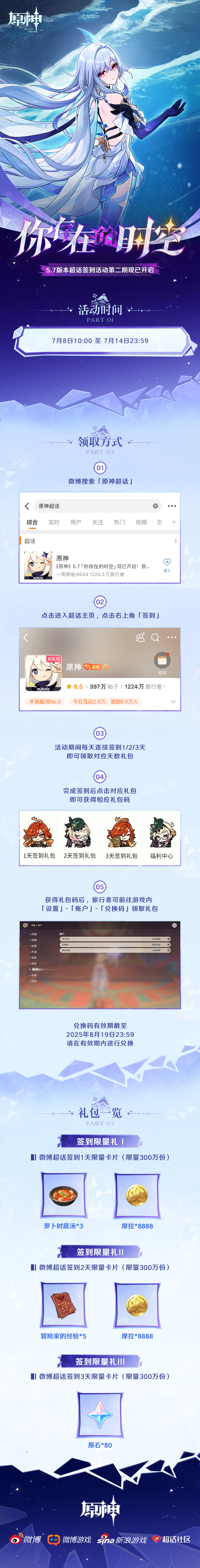 活动期间,在原神超话内连续签到1/2/3天,即可领取并在游戏内兑换对应天数礼包。