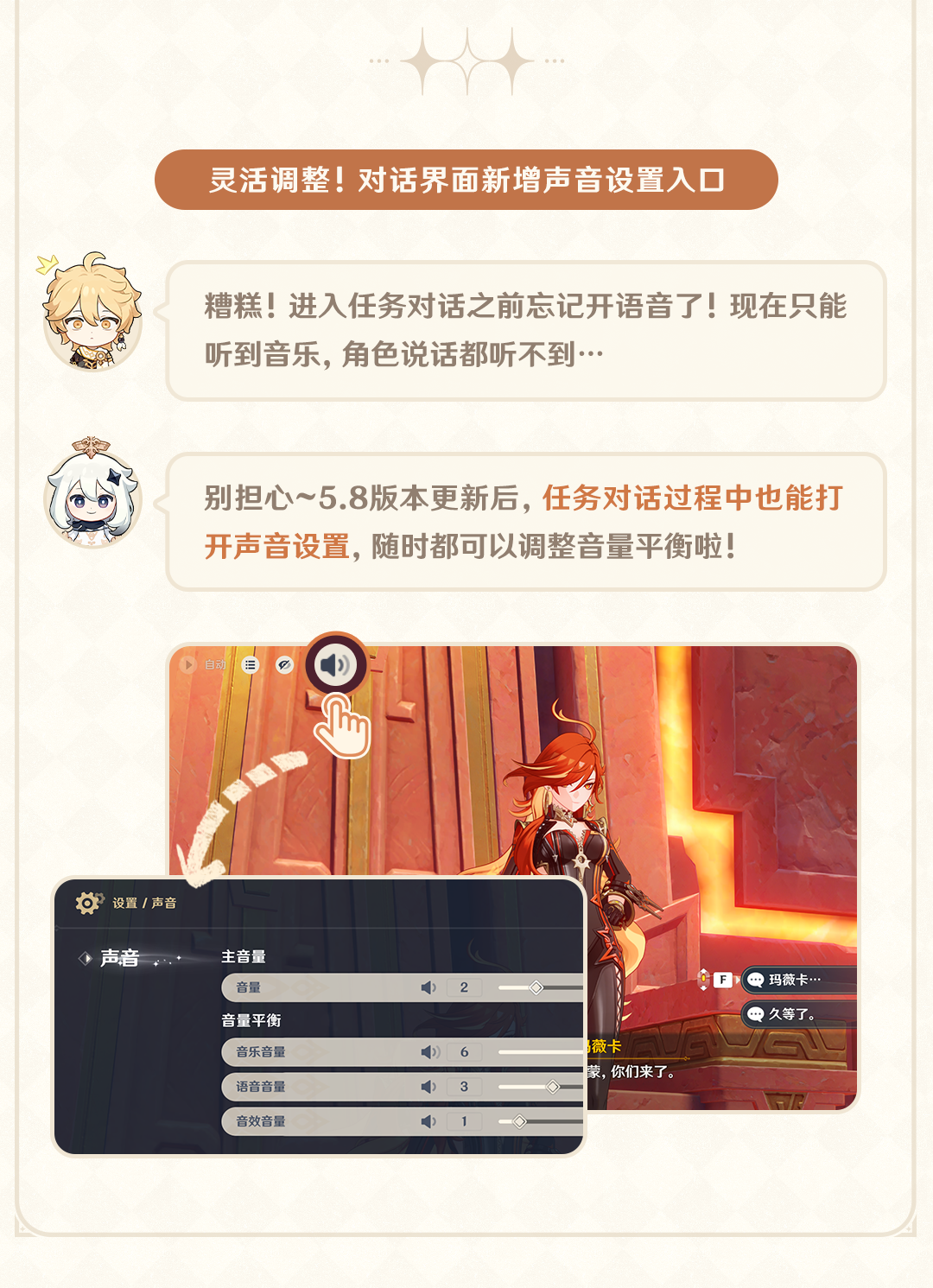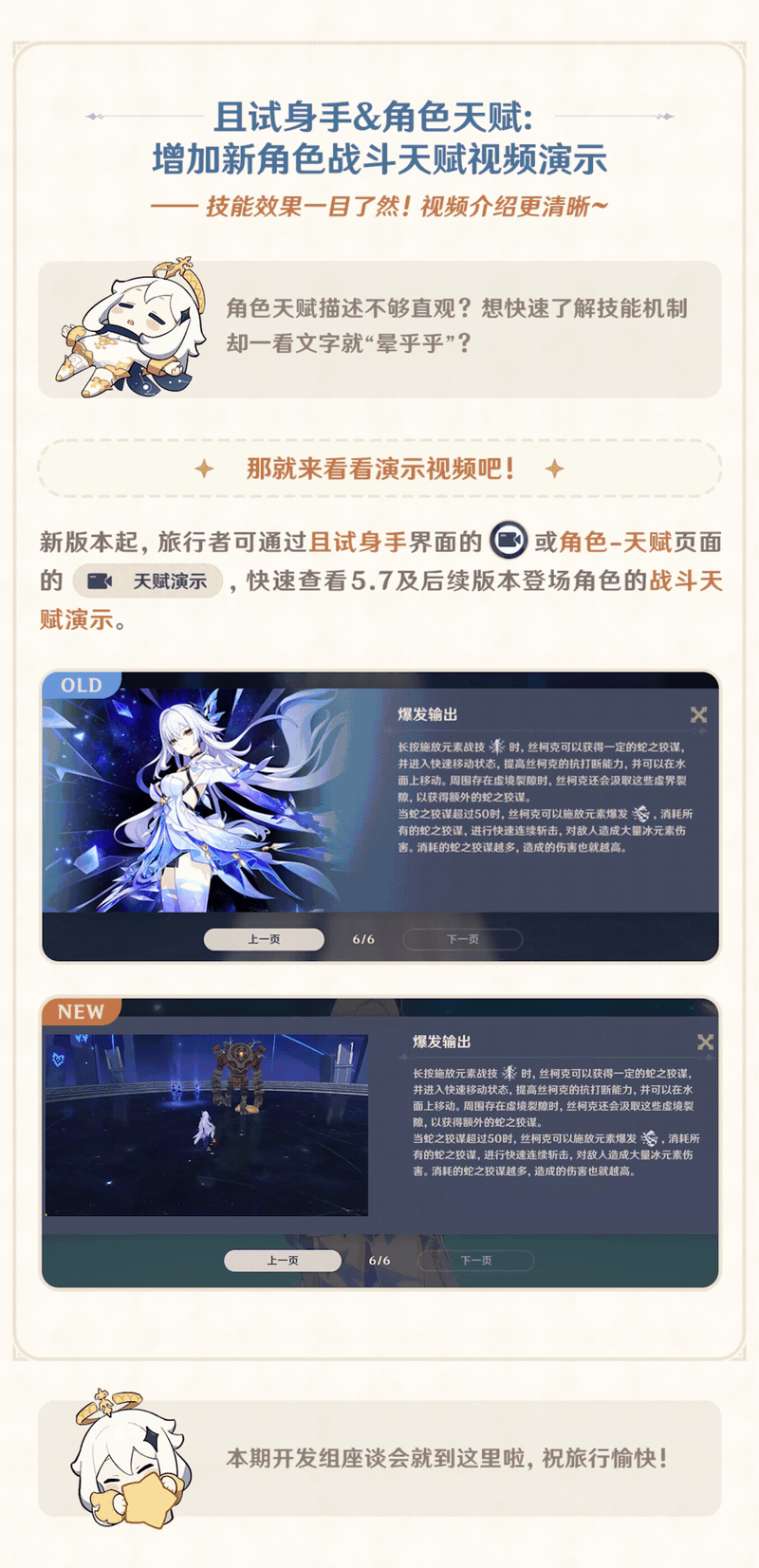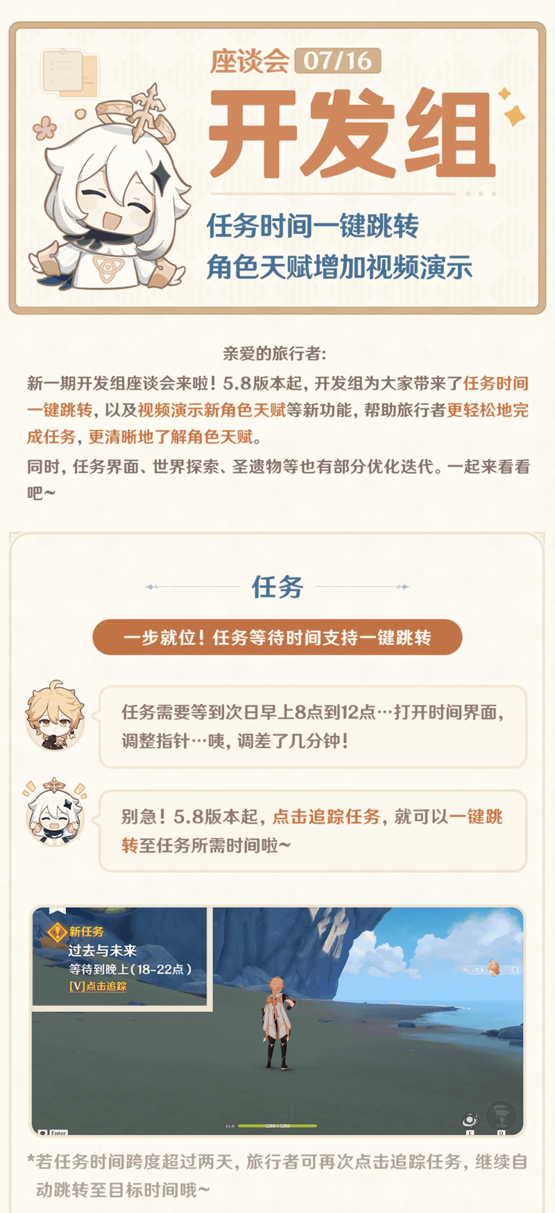 新一期开发组座谈会来啦!5.8版本起,开发组为大家带来了任务时间一键跳转,以及视频演示新角色天赋等新功能,帮助旅行者更轻松地完成任务,更清晰地了解角色天赋。