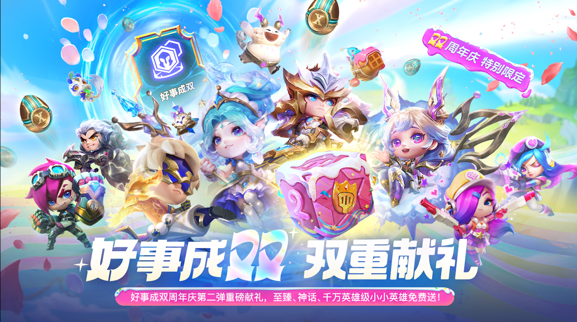 这次周年庆主题既然是好事成双,那我们的好礼更要成双!在这次周年庆典上,我们为各位弈士们双重献礼,并带来了值得大家期待的大惊喜,那就是我们即将开启周年庆特别限定活动,第二波惊喜重磅来袭:在9月15日至9月28日活动期间,弈士们只需完成一场对局并动动小手分享活动,即可开启双周年特别限定宝箱。包含大家喜爱的【至臻 剪纸仙灵 小小格温】,【电玩女神 小小凯特琳】等至臻神话级小小英雄,以及千万份英雄级小小英雄都有机会等待着各位弈士们抽取!一定要留心关注后续官方公告的详细规则哦,好事成双,双重献礼,好运更会加倍!