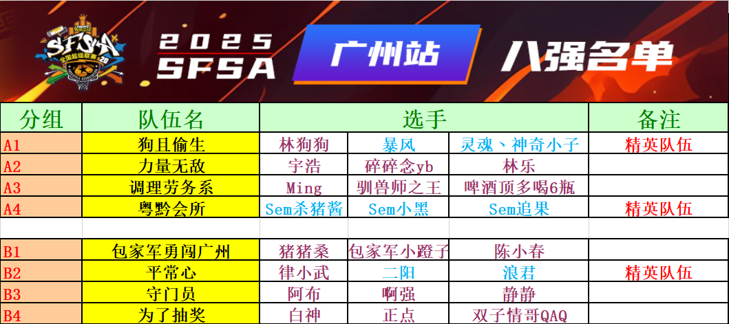 广州赛区八强群英荟萃,基本都是十分熟悉的实力选手。SFSA广州站8进4分组出炉,A组妥妥的死亡之组,2支精英战队加上碎碎念YB的队伍,B组中二阳浪君律小武晋级四强概率较高,另外一个名额竞争也将十分激烈,其中2支包家军战队被分到了B组,极有黑马潜质。