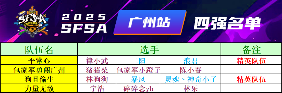 SFSA广州站有许多我们熟悉的选手出战、二阳浪君律小武、完爆、小白花、36、白云苍狗暴风、小芳心、等知名选手都来到广州站参加比赛,还有许多FSPL新秀来到了广州站,像Yx、鲨鱼、小黑以及追梦等选手。广州站玩家们参赛的热情十分高涨,有许多都是第一次参赛的玩家,都来体验线下的激情氛围,现场不少FSer成功组队体验线下的激情。广州站FSPL新秀队伍遭遇滑铁卢,PSG新秀分成两支队伍参赛但都无奈出局,小白花鑫别输给了自己的徒弟,可见广州站比赛强度相当之高!