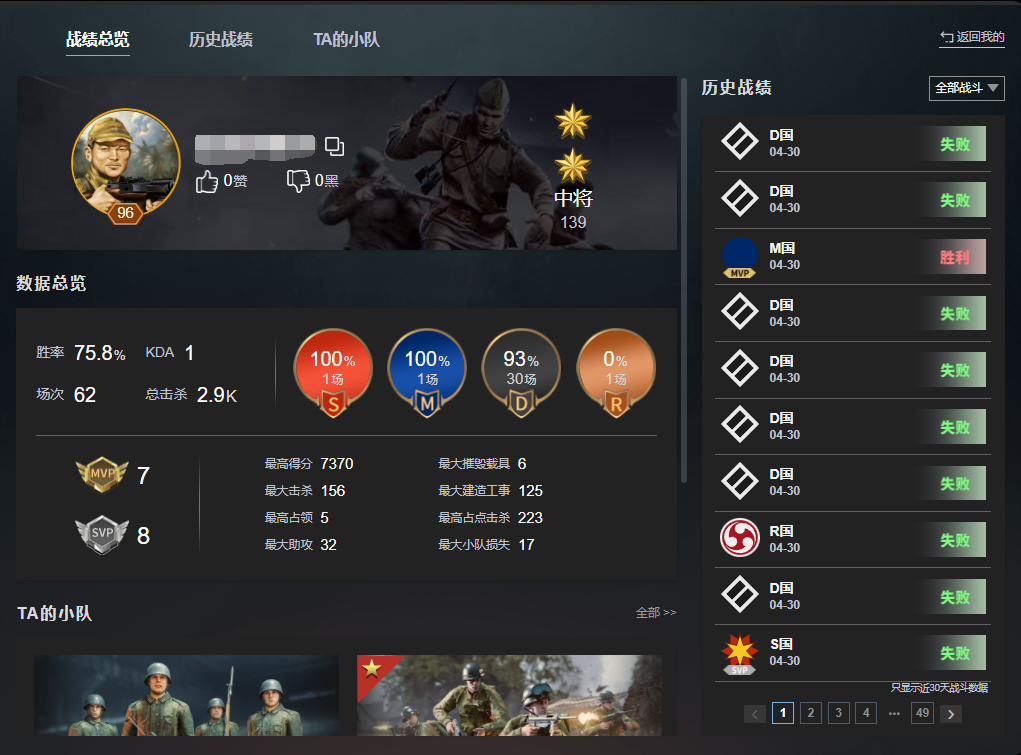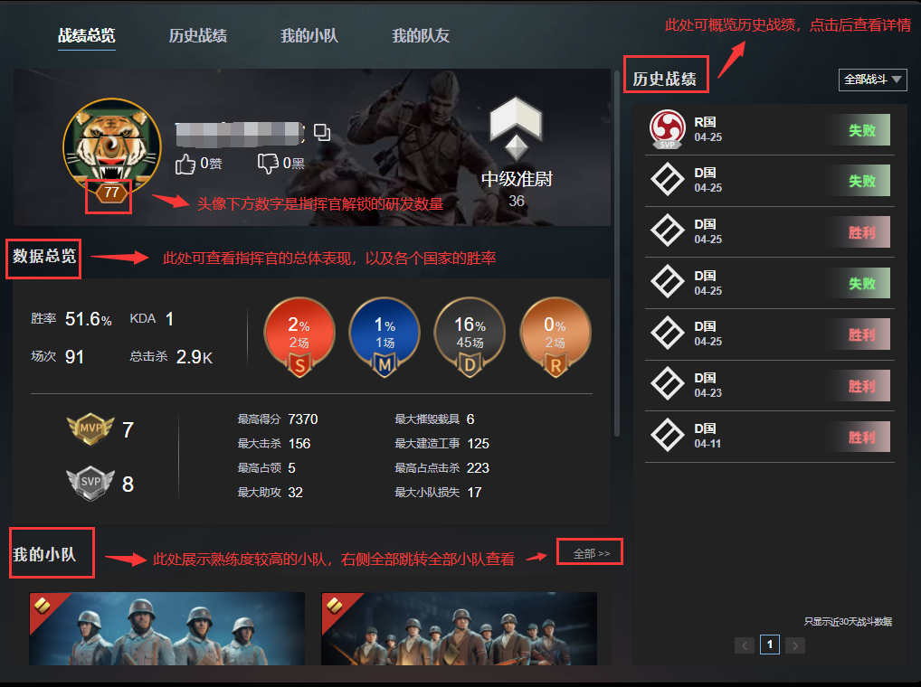 指挥官可通过战绩总览查看历史战绩、小队、研发数量以及整体表现。