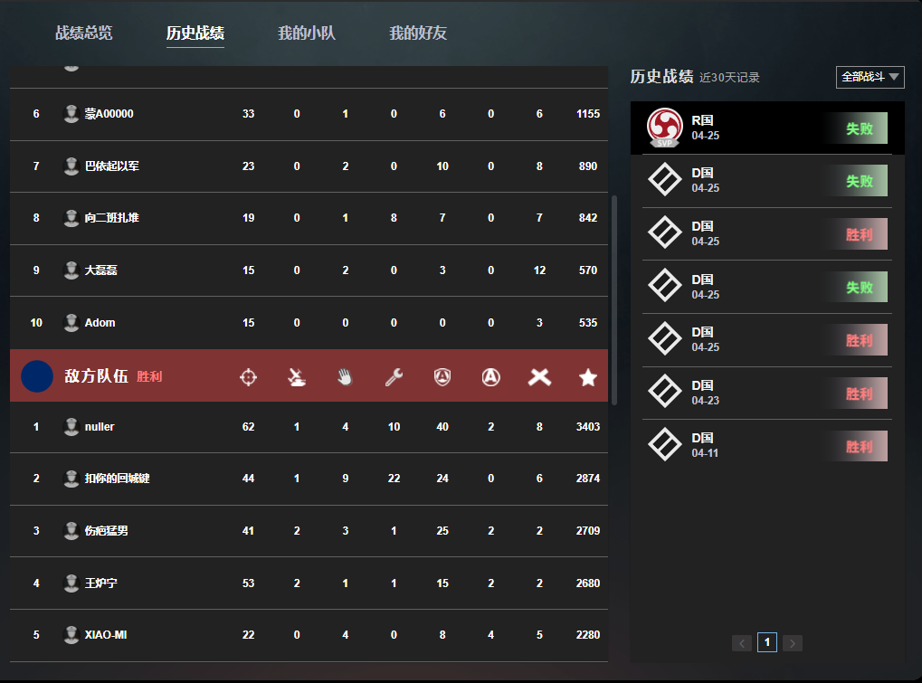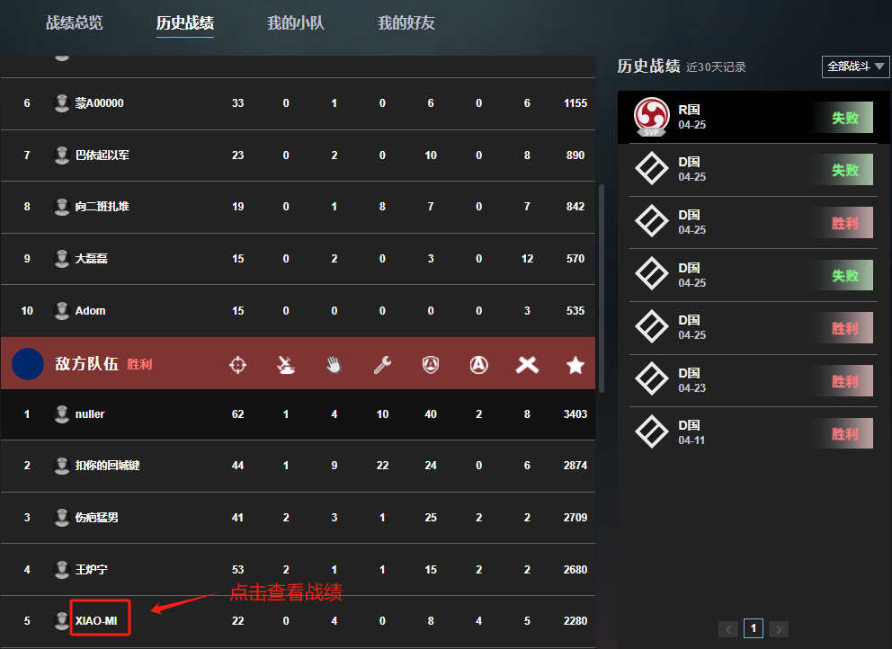历史战绩部分展示了指挥官近期的对局记录,点击其他指挥官的昵称还可便捷地查看其战绩。需要注意的是,历史战绩仅展示近30天的对局记录。