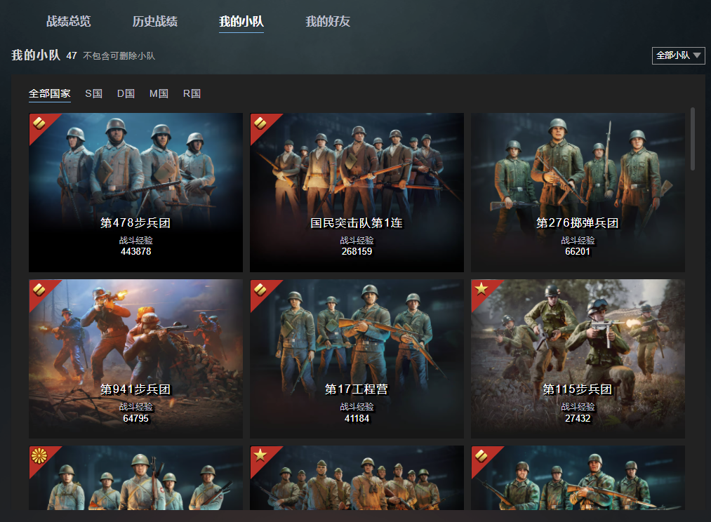 在我的小队界面,您可以查看到所拥有小队的数量及战斗经验,从而便捷地了解自身擅长的小队类型和国家。需要注意的是,此处展示的小队不包括游戏内可删除的小队。