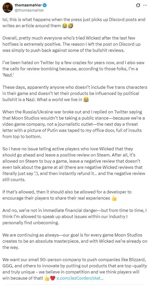 近日,外媒WindowsCentral发布了一篇关于《恶意不息》开发商Moon Studios总裁托马斯·马勒(Thomas Mahler)的新闻,其中提到托马斯曾在Discord平台呼吁玩家留下正面评价,因为这可能导致工作室面临关闭风险。这篇报道让托马斯感到不满,他认为该媒体的观点——“由于《恶意不息》受到Steam负面评价的影响,可能导致工作室关门”——是在暗示他们在绑架玩家“必须给好评”,并对《恶意不息》及Moon Studios进行抹黑。
