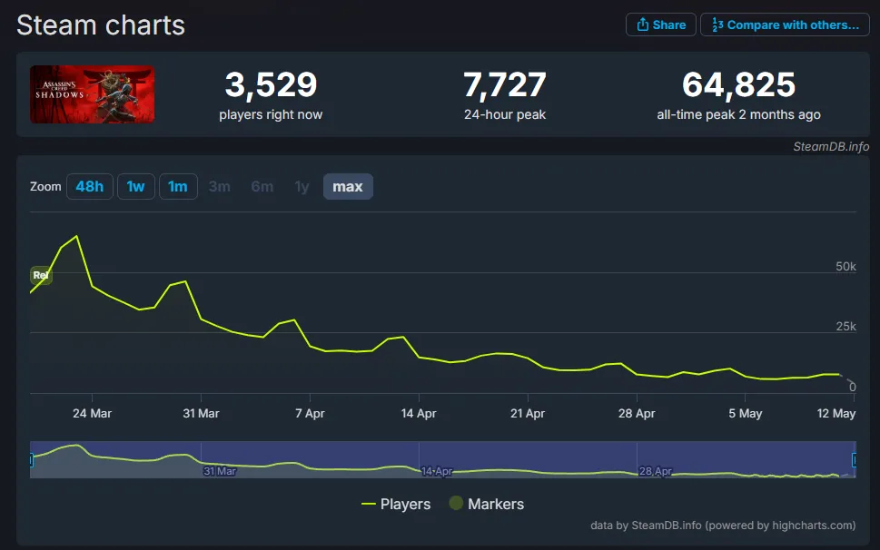 育碧旗下最新力作《刺客信条:影》在发售初期表现抢眼,Metacritic评分达到了82分,并在Steam平台取得了令人瞩目的首发成绩。这款游戏在刚推出时,曾创下近7万名玩家同时在线的纪录,然而随后却遭遇了玩家数量的显著流失。截至目前,《刺客信条:影》的日均在线人数已跌至7,727人,玩家数大幅减少了90%。不仅如此,游戏在主机平台的表现也不尽如人意。在PS平台上,《刺客信条:影》已滑落至第19位,而根据TrueAchievements的统计,游戏在Xbox平台的排名也跌至第22名,与发售近7年的《荒野大镖客2》不相上下。