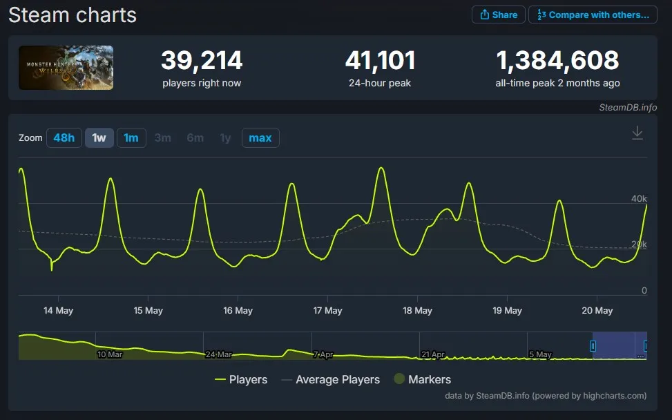 根据SteamDB统计数据,5月19日当天《怪物猎人:荒野》的在线峰值仅为4.1万,而此前最高峰值曾达到138.4万,下降幅度达到97%。相比之下,《怪物猎人:世界》在发售至今的7年多时间里,同期在线峰值(2.6万)相比最高值(33.4万)仅下跌了不到92%。这些数字仅限于Steam平台,考虑到其他平台的情况,跌幅可能更大。若只看平均玩家数量,3月份《怪物猎人:荒野》的平均玩家人数为378,500人,而过去30天的平均玩家人数仅为53,842人,这比首发周峰值下降了86%。