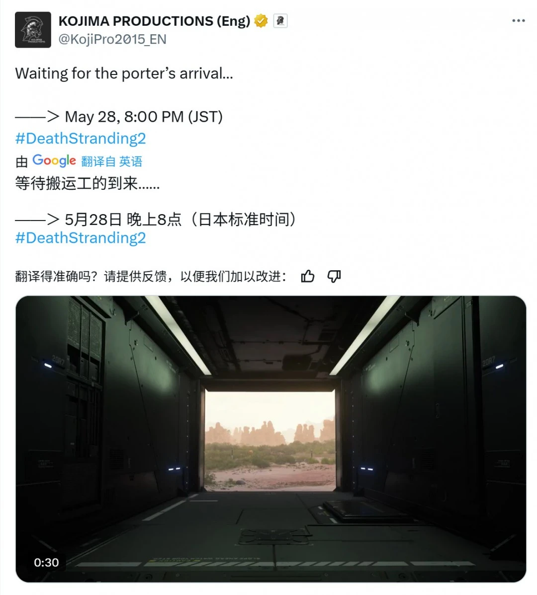 《死亡搁浅2》将于6月26日登陆PS5平台发售。小岛工作室官推宣布,他们将在北京时间5月28日晚上7点发布重大消息,并配文“等待搬运工的到来”,这可能是新的预告片,因为发售日期已经确定。此前,小岛秀夫曾透露《死亡搁浅2》中将出现新角色搬运工Bokka。