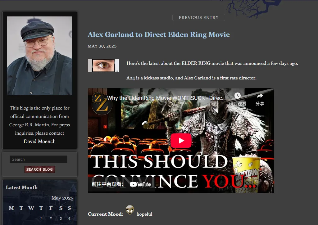 《权力的游戏》制作人兼原著作者乔治·R·R·马丁近日在个人博客中首次回应《艾尔登法环》电影化的消息,并对导演人选发表了看法。马丁在博文中写道:“关于前几天公布的《艾尔登法环》电影最新动态:A24是一家优秀的制作公司,亚历克斯·嘉兰是顶尖导演。”虽然他未透露更多细节,但其博文标注的“当前心情”为“满怀希望”。耐人寻味的是,马丁还附上了油管博主Zayf the Scholar发布的视频链接,视频名为《为何<艾尔登法环>电影不会翻车——导演真实实力大揭秘》。