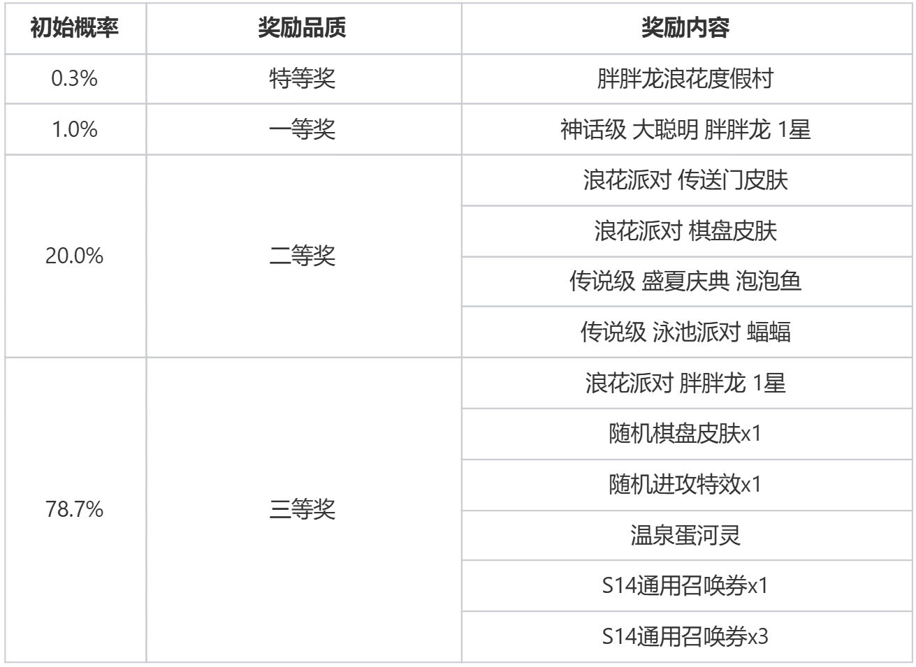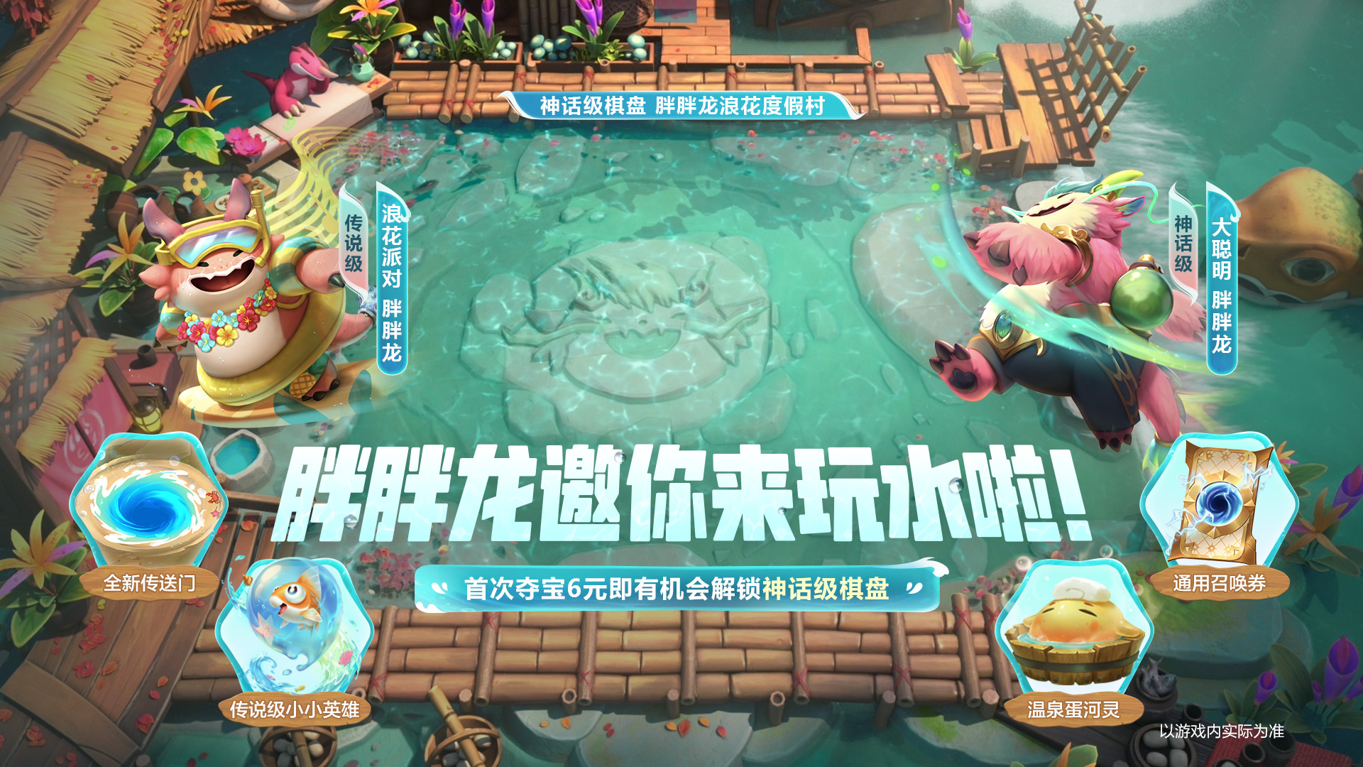 派对浪花,清凉一夏,胖胖龙喊你来玩水啦!云顶之弈夏日派对夺宝现已开启,首次夺宝仅需6元!每次夺宝均有机会直接解锁神话级棋盘【胖胖龙浪花度假村】、神话级小小英雄【大聪明 胖胖龙 1星】、全新传送门皮肤【浪花派对】等好礼