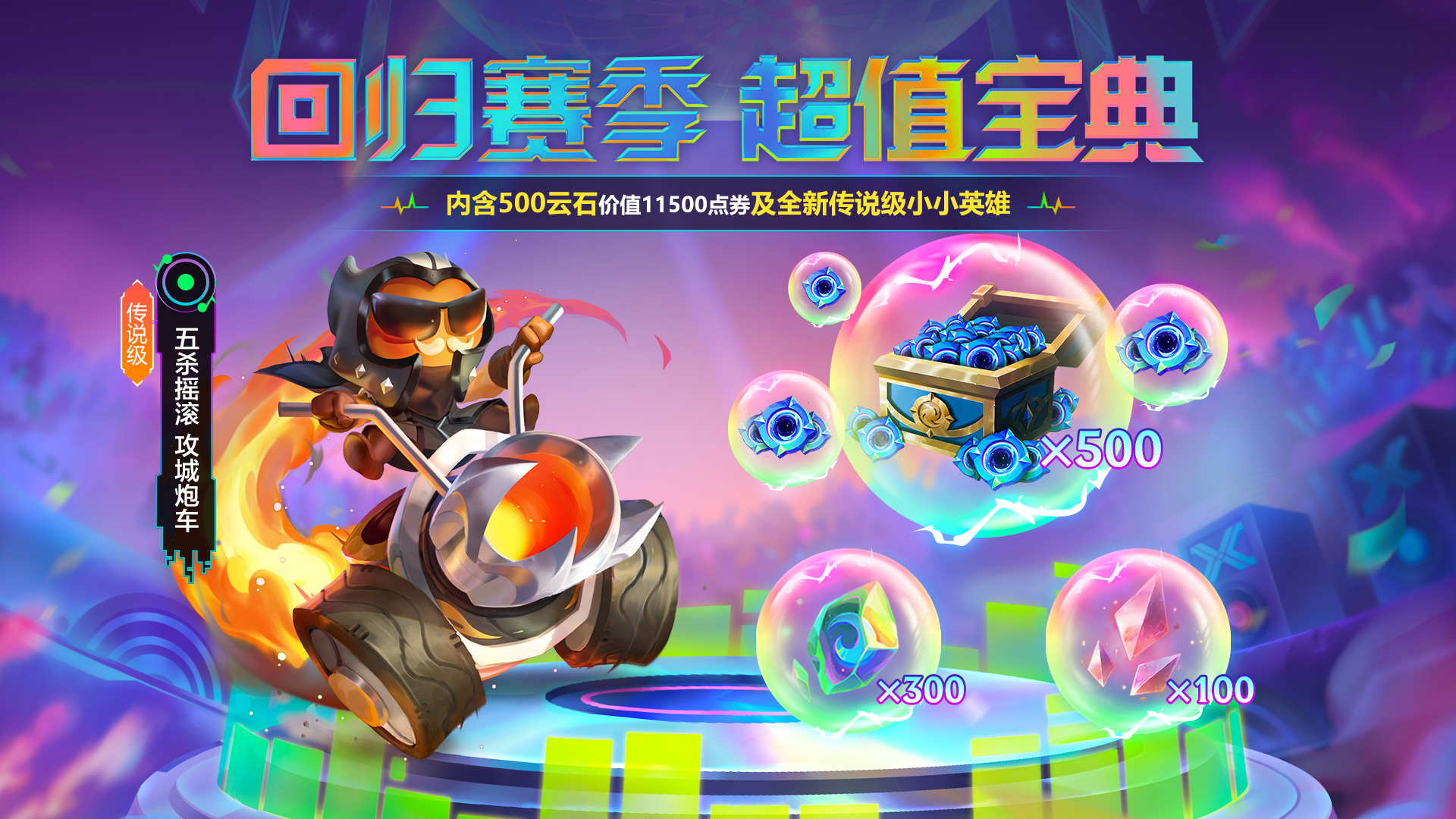 回归赛季宝典即将上线,4900点券解锁即可解锁至多500云石及全新传说级小小英雄【五杀摇滚 攻城炮车】!