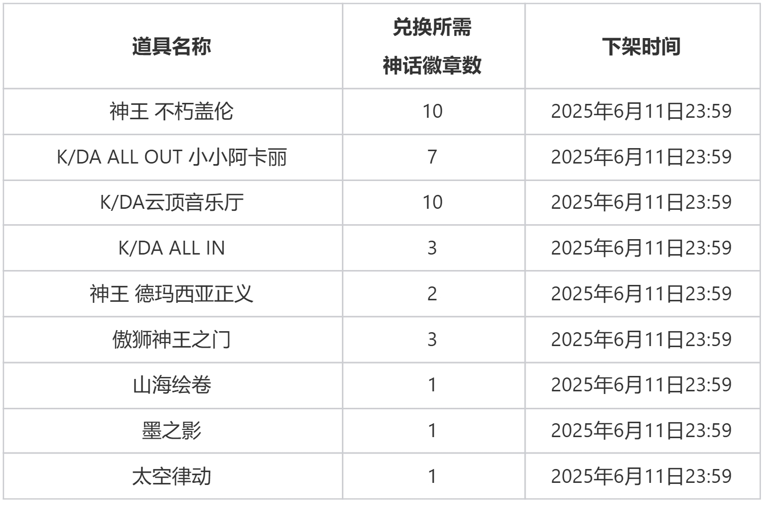5月15日版本更新后,新增可消耗“神话徽章”兑换的道具及价格如下表所示,此前版本中未达下架时间的道具依然可被兑换。