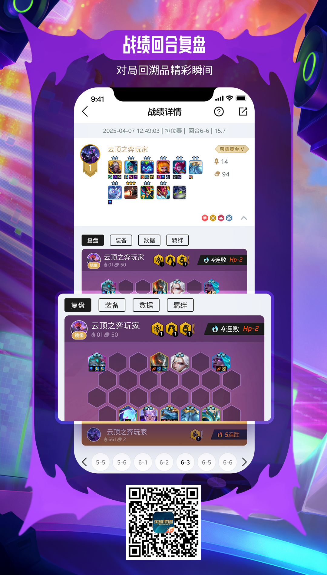 掌上英雄联盟云顶之弈战绩详情页现已更新战绩回合复盘功能,打开【掌上英雄联盟】——【我的】——【云顶之弈】战绩页可以回顾战局回合详情,复盘操作提升技术,上分快人一步!