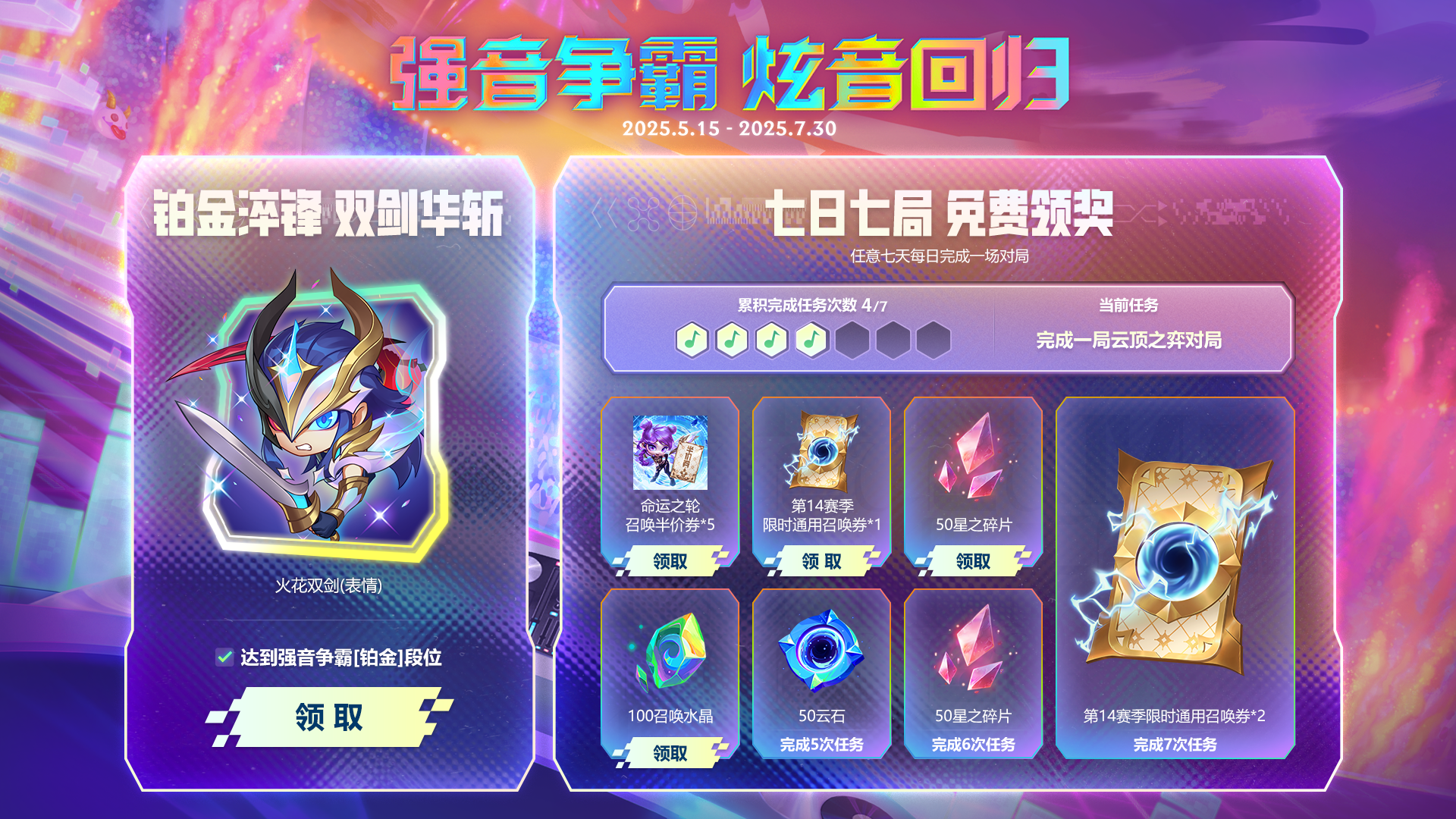 强音争霸,炫音回归,5月15日版本更新后,强音争霸赛季即将限时回归,回归期间任意七日七场对局,即可解锁云石、星之碎片、召唤水晶、第14赛季限时通用召唤券等奖励,同时在强音争霸模式中达到铂金段位,还可领取火花双剑表情!