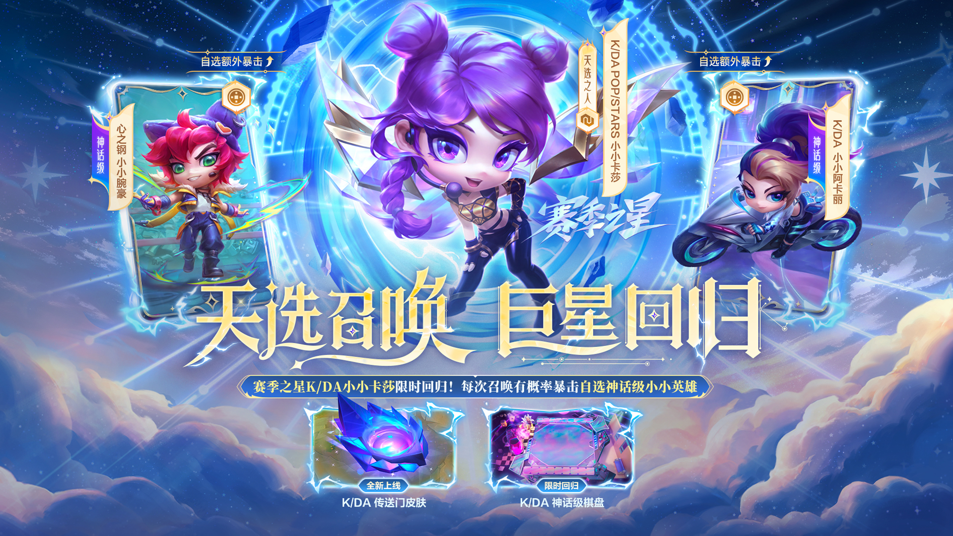 天选召唤,巨星回归,命运之轮再次开启,天选之人【赛季之星 K/DA POP/STARS 小小卡莎】限时回归,每次召唤都有概率额外暴击解锁【自选神话小小英雄】!