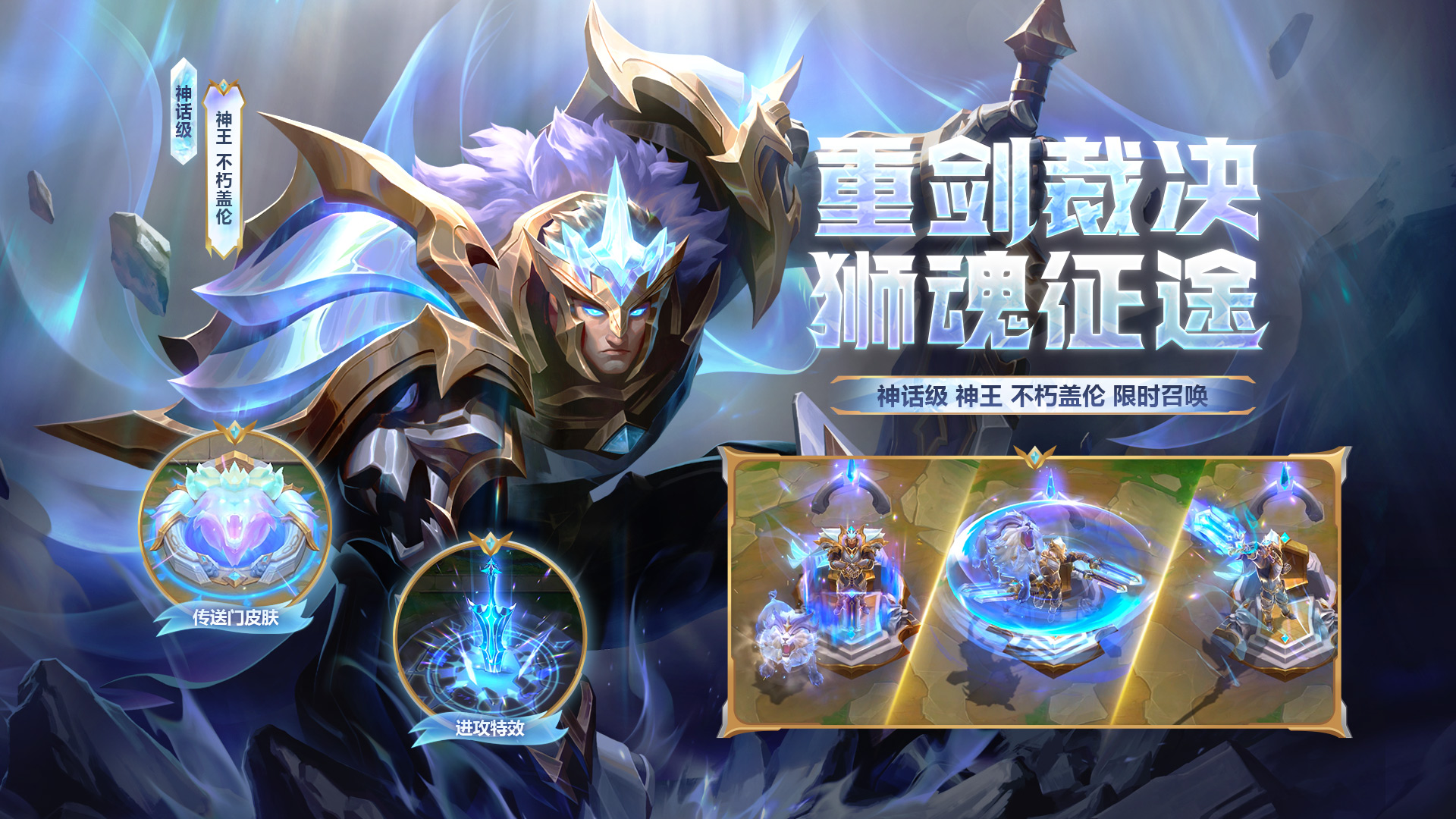 重剑裁决,狮魂征途,神话级【神王 不朽盖伦】君临云顶,手持重剑,狮魂随行,主题传送门皮肤与进攻特效即是王的象征!