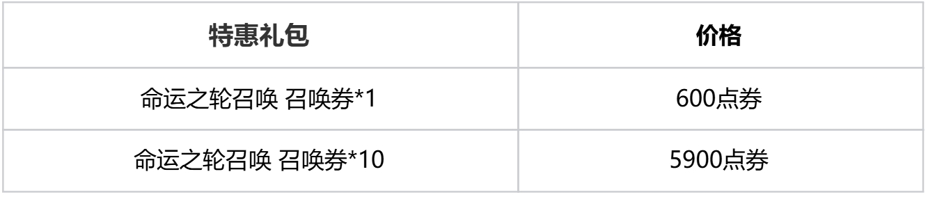 ●特惠召唤:活动期间,玩家可付费解锁命运之轮召唤 召唤券礼包(每个礼包单Q单大区限购1次),内容及价格如下: