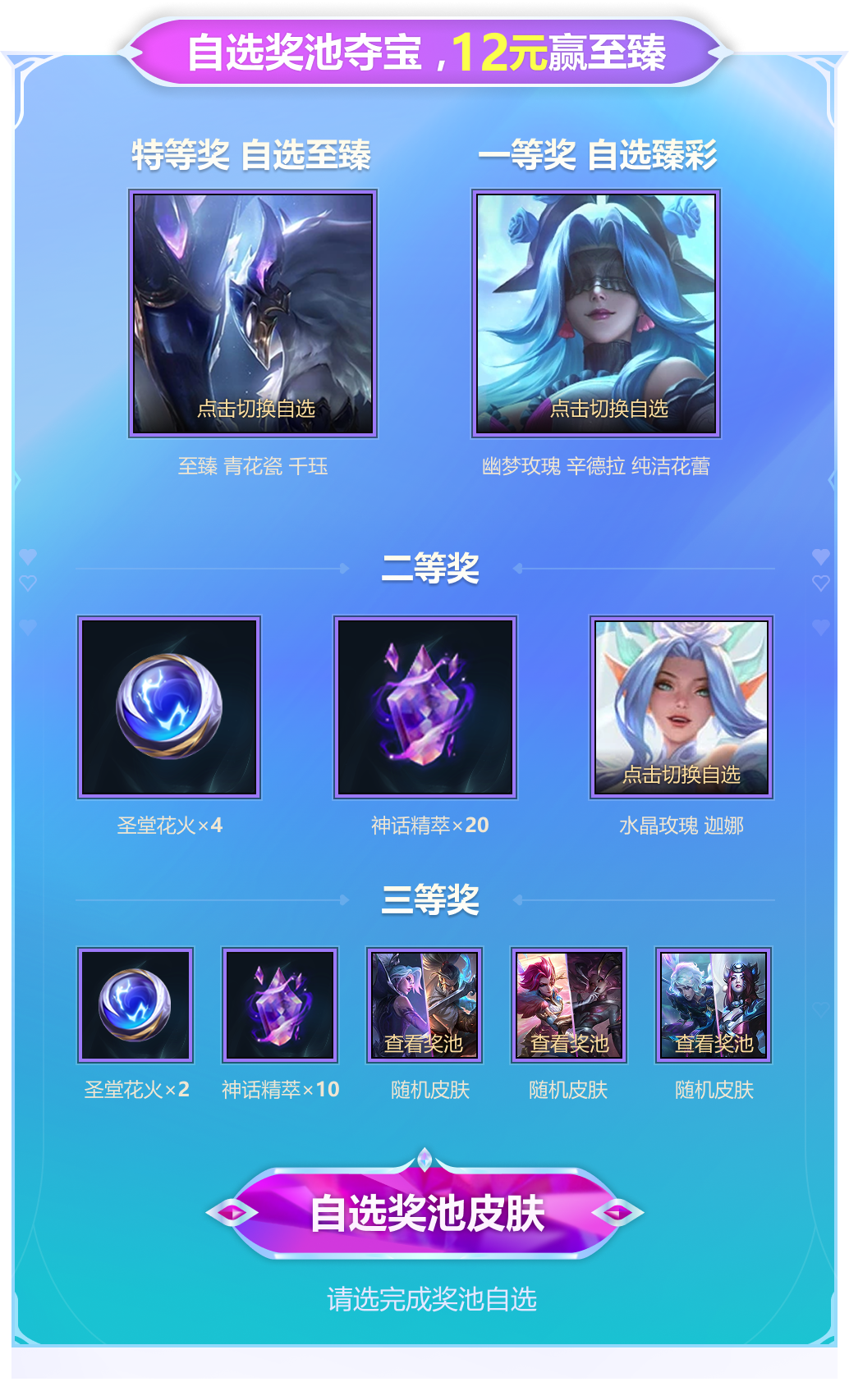 1、玩家可预先自选1个至臻(特等奖),1个臻彩(一等奖),1个限定皮肤(二等奖),再和神话精萃、随机皮肤,圣堂花火一共组成10个道具,参考示意图如下。