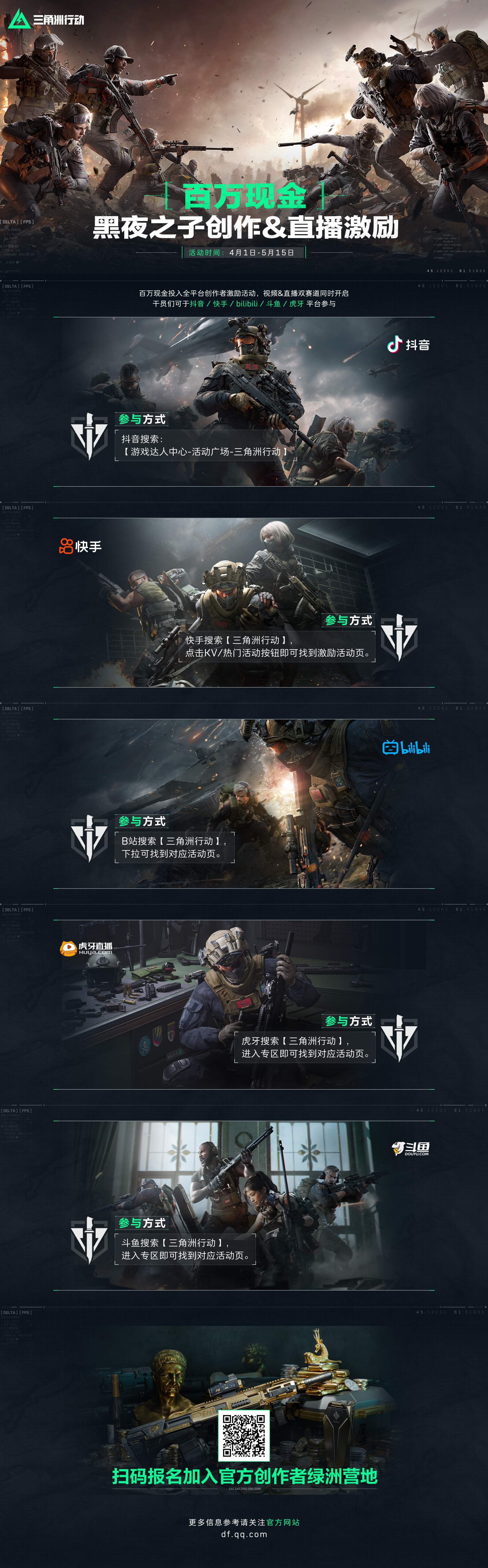 《三角洲行动》4-5月达人创作&直播激励开启!高额现金投入多家平台合作,视频&直播双赛道同时开启,更有巨额流量扶持等你来拿。干员们可于抖音/快手/bilibili/斗鱼/虎牙 平台参与,戳以下链接跳转至目标平台激励页面,了解更多活动详情。抖音内容创作赛道与直播赛道政策激励详情,请按以下路径进入:打开抖音-搜索 游戏达人中心-活动广场-三角洲行动