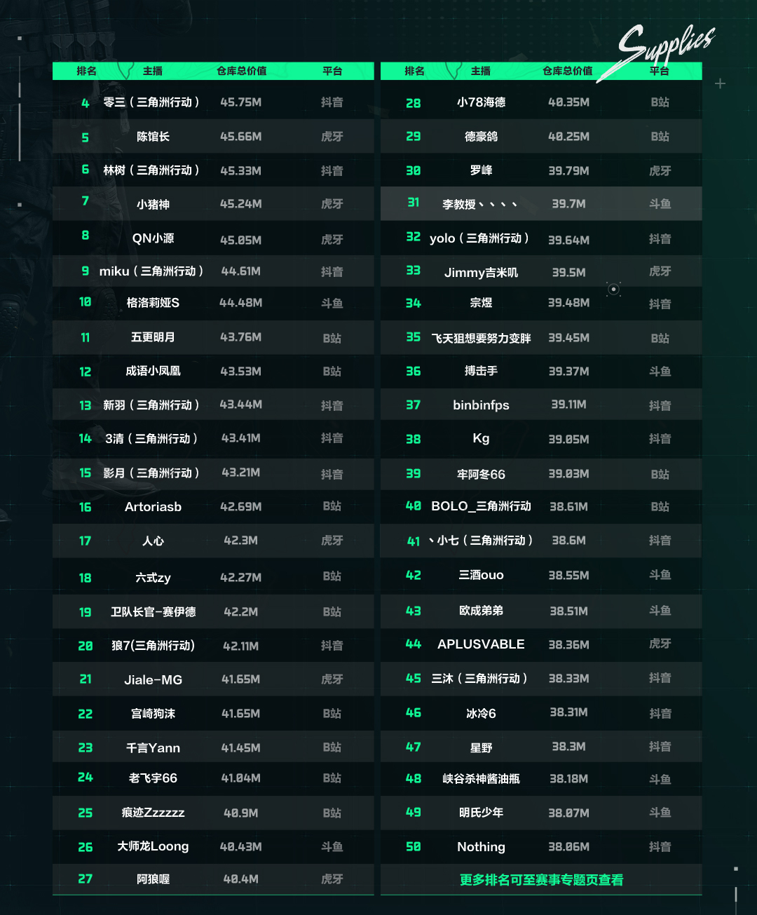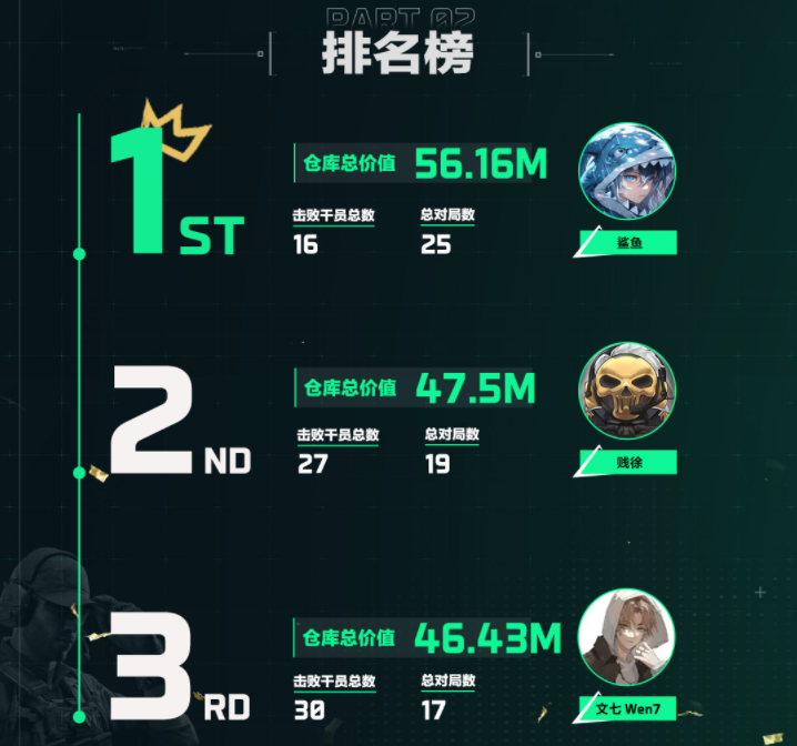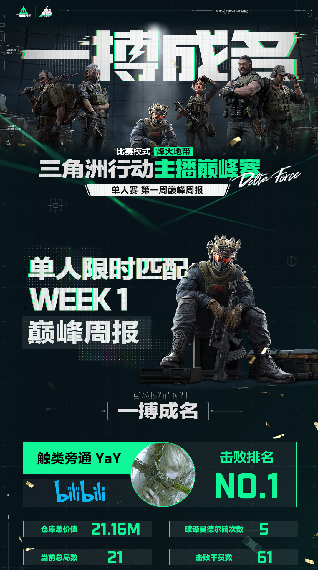 首周赛程已结束,恭喜来自B站的主播【触类旁通YaY】拔得干员击败榜头筹!丫丫凭借精准的枪法与细腻的地图理解,结合充满侵略性的战斗风格,多次以一己之力以少敌多,制造无数名场面,在21场对局中狂揽61个击败,给大家留下了深刻印象。