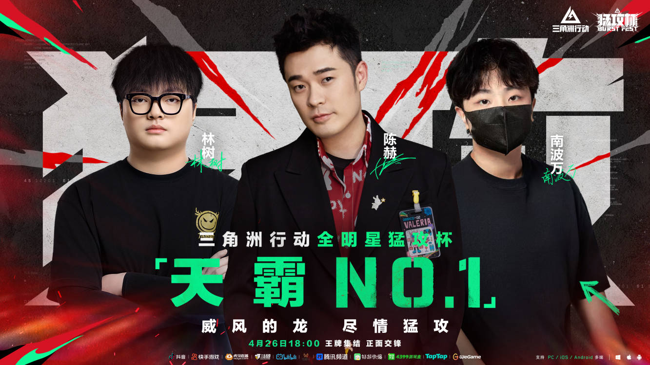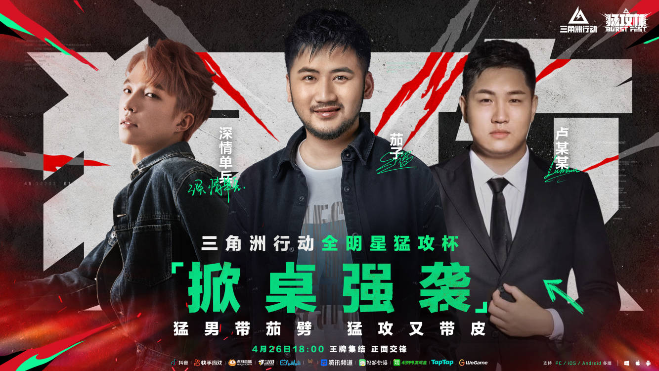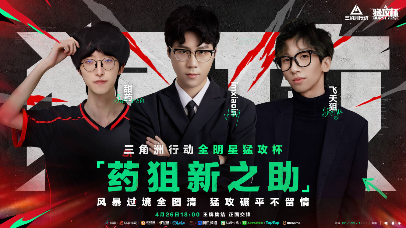 4月26日(星期六)18:00-22:00,锁定抖音、快手、Bilibili、斗鱼、虎牙、视频号等平台,观看《三角洲行动》全明星猛攻杯!顶流跨界之战,智谋双具的对决,还有猛猛掉落的看播福利一齐放送!