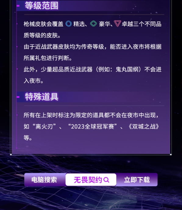 本期夜市的道具将涵盖从2023年7月12日(正式上线日)至2025年3月6日(2025赛季第一幕结束日)期间首次推出的所有道具。本期夜市将全新加入【异鳞魔蛇】、【奇幻朋克//2.0】和【海洋之星//2.0】礼包中的内容。